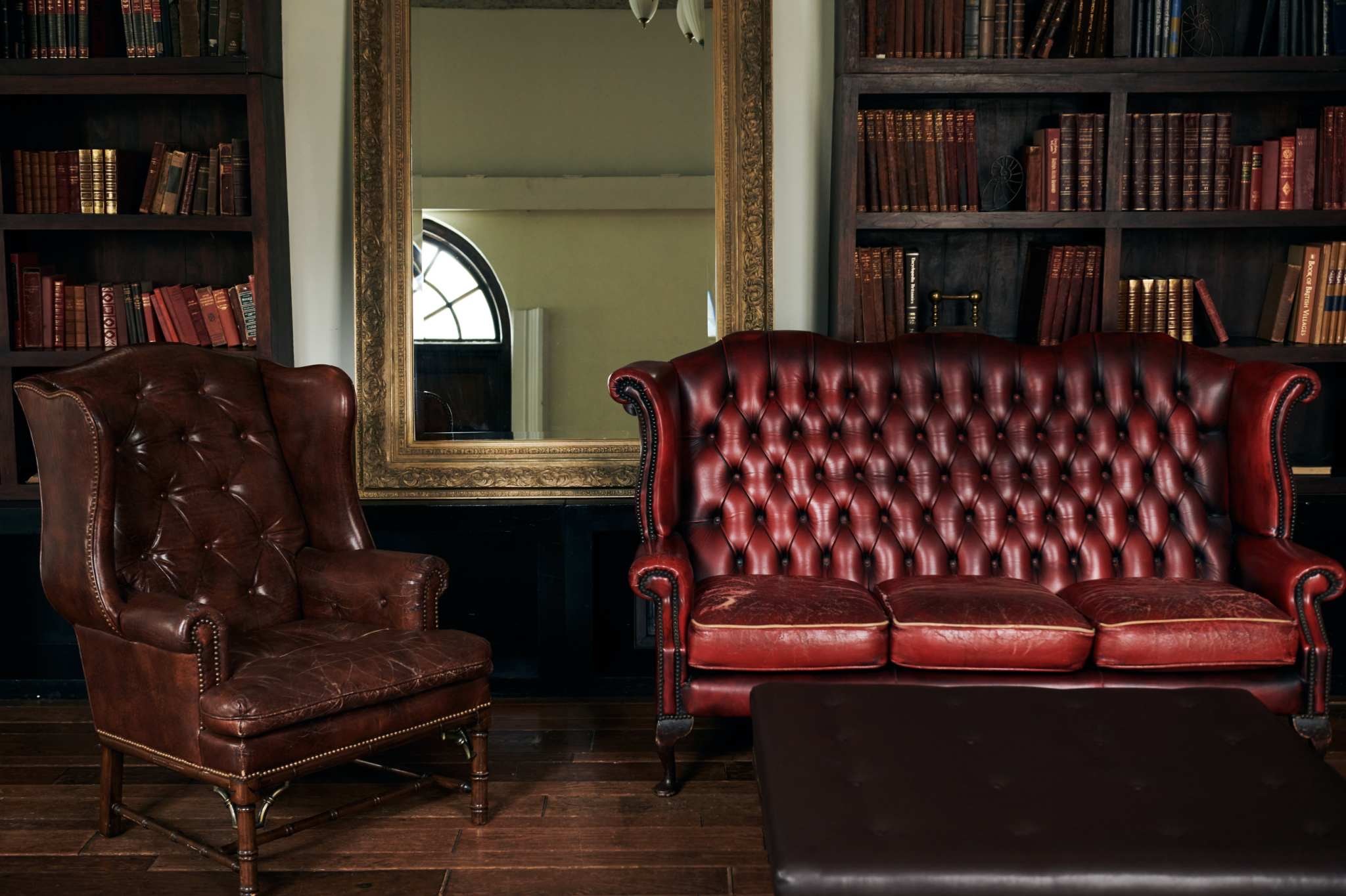 大きな本棚にたくさんの古書が並んだシックなシチュエーションです。