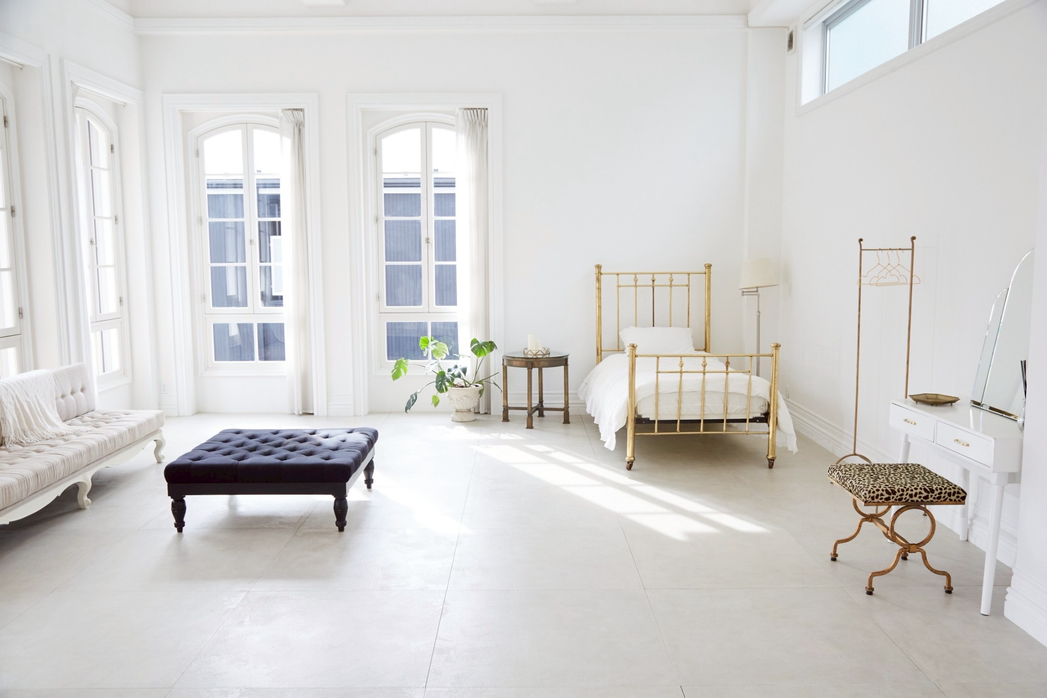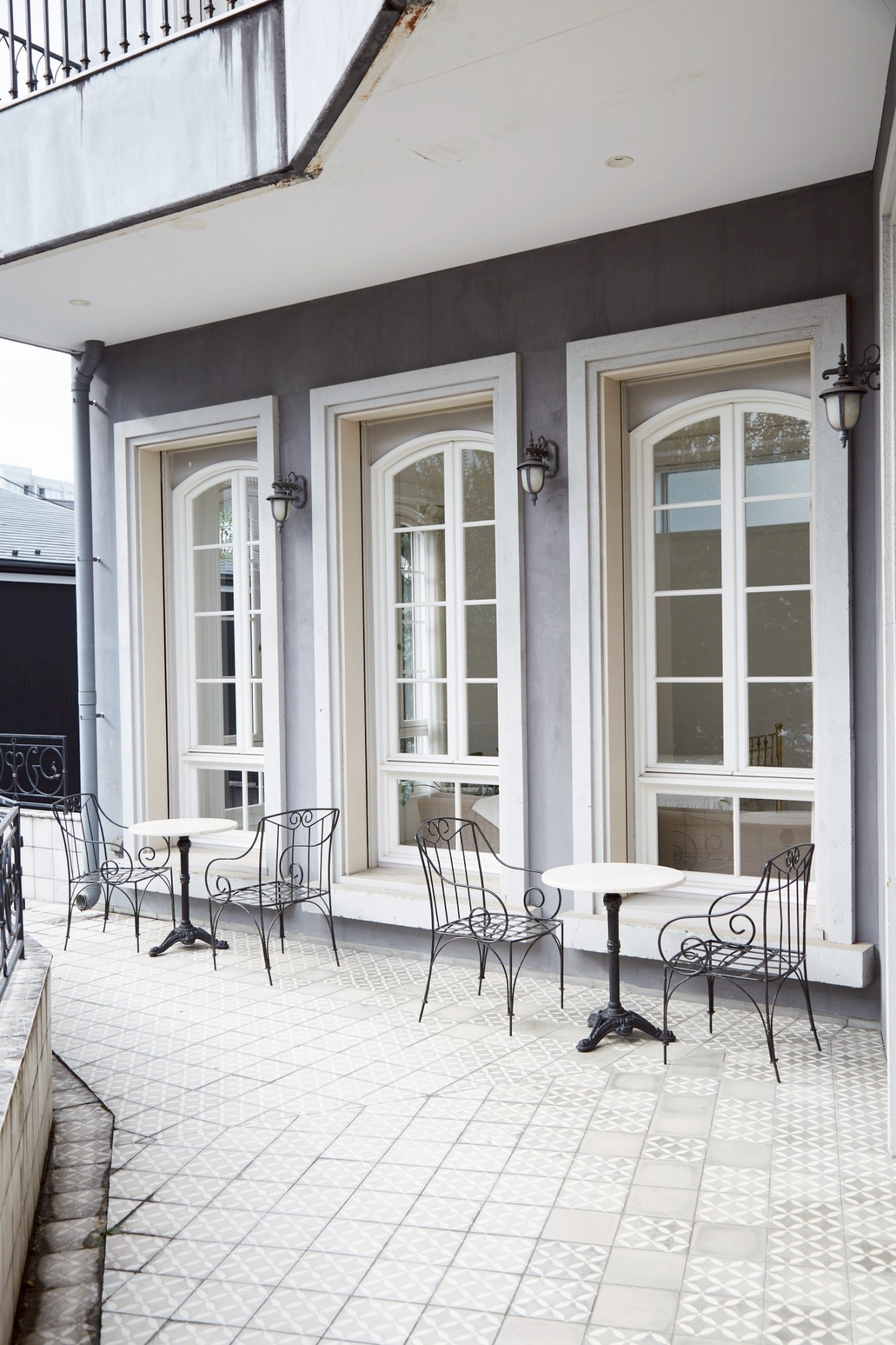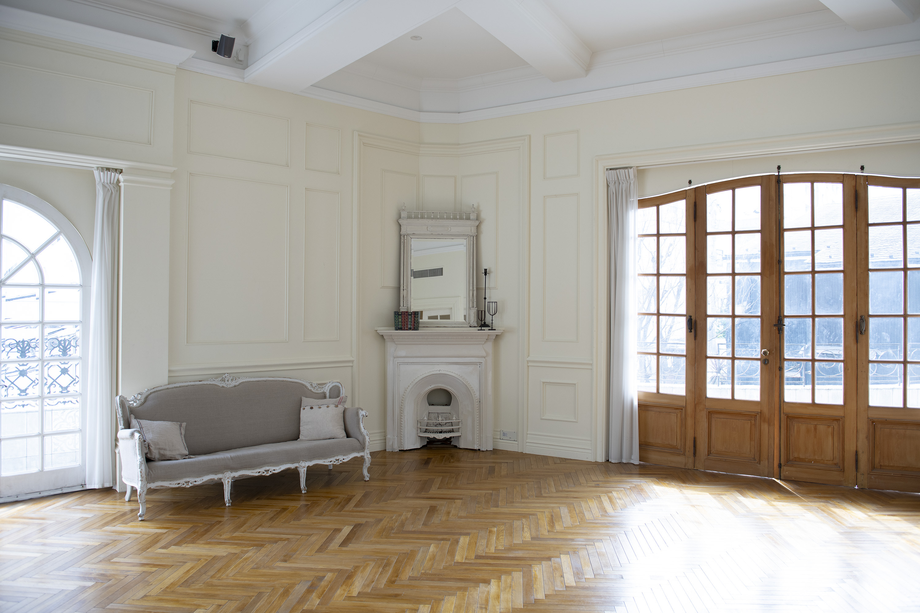 大きな5連窓から優しい光が入る、広々としたスペースで、白い壁やヘリンボーンの床などクラシカルな雰囲気です。