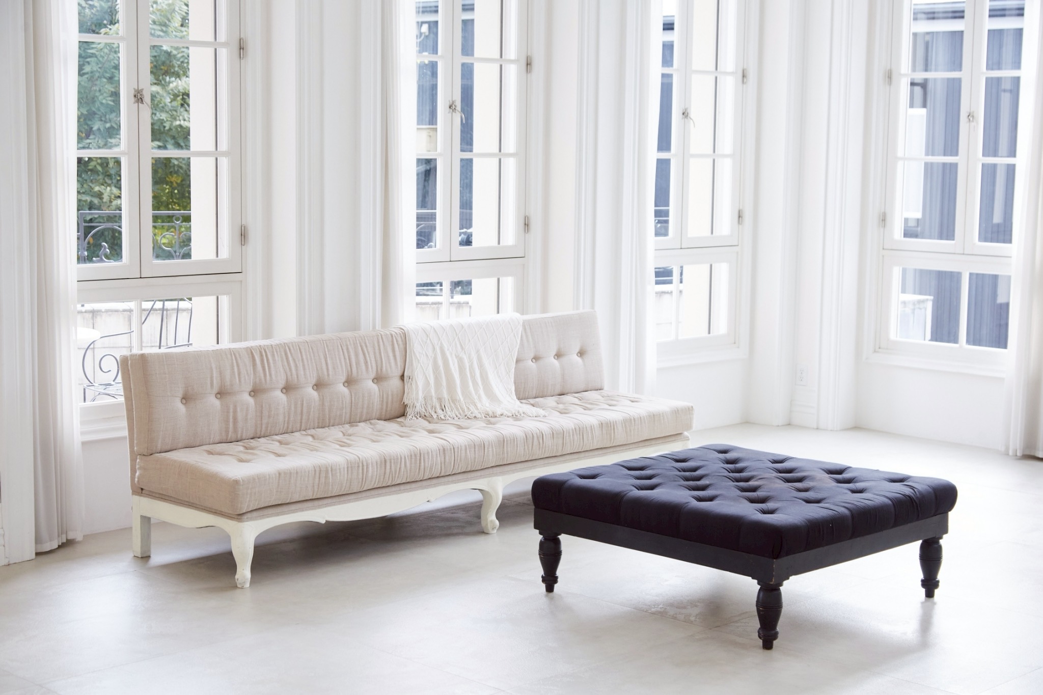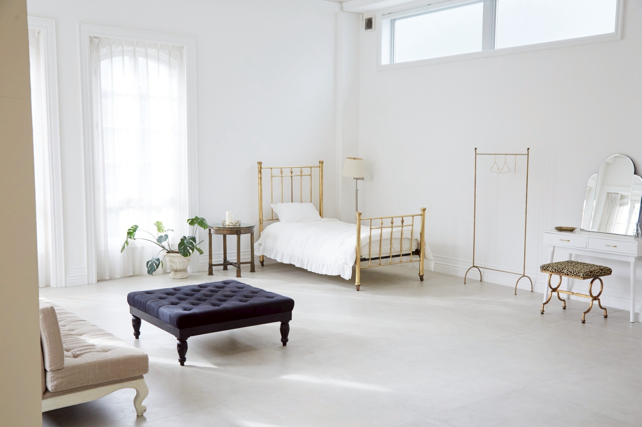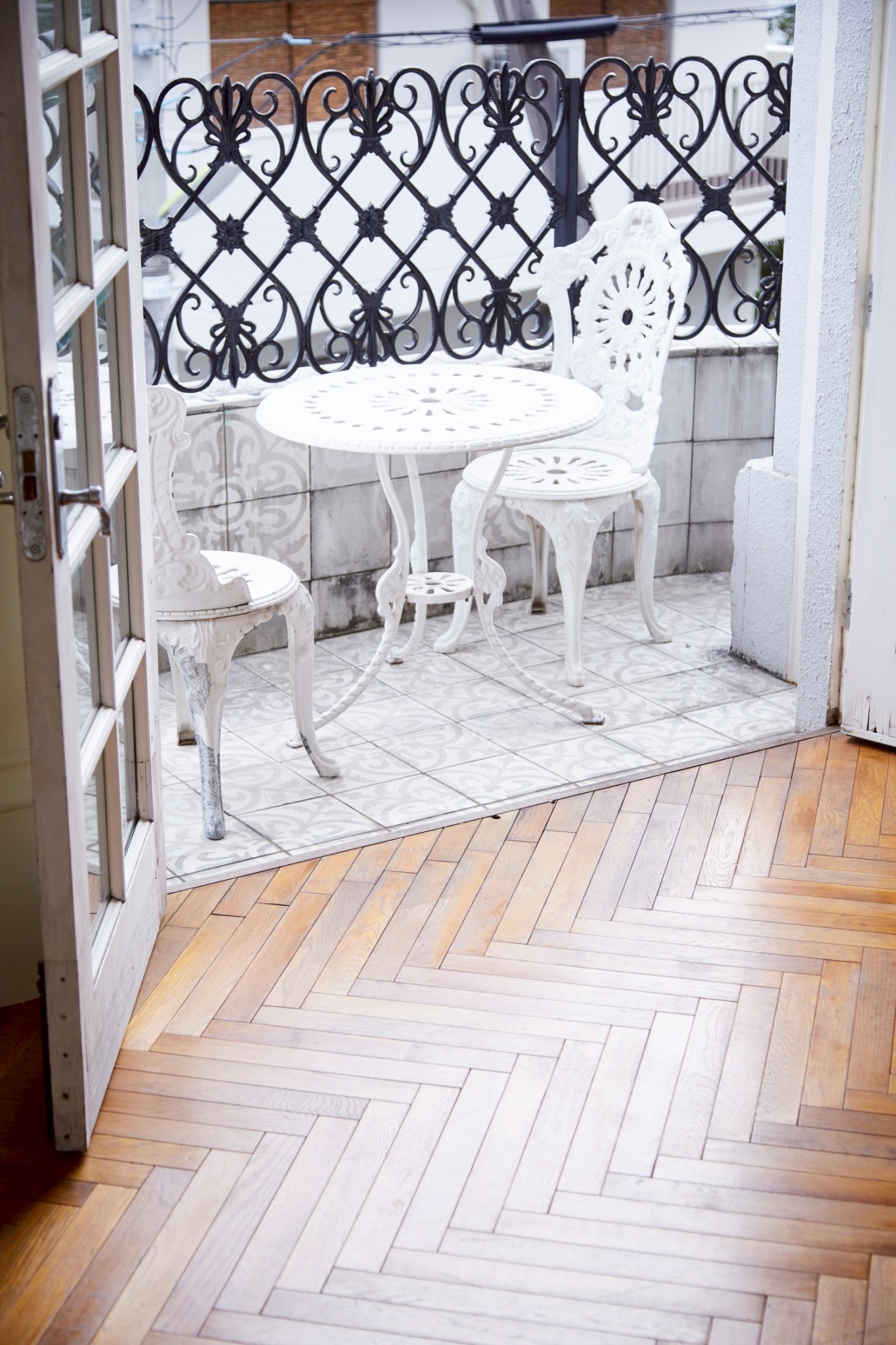 大きな5連窓から優しい光が入る、広々としたスペースで、白い壁やヘリンボーンの床などクラシカルな雰囲気です。